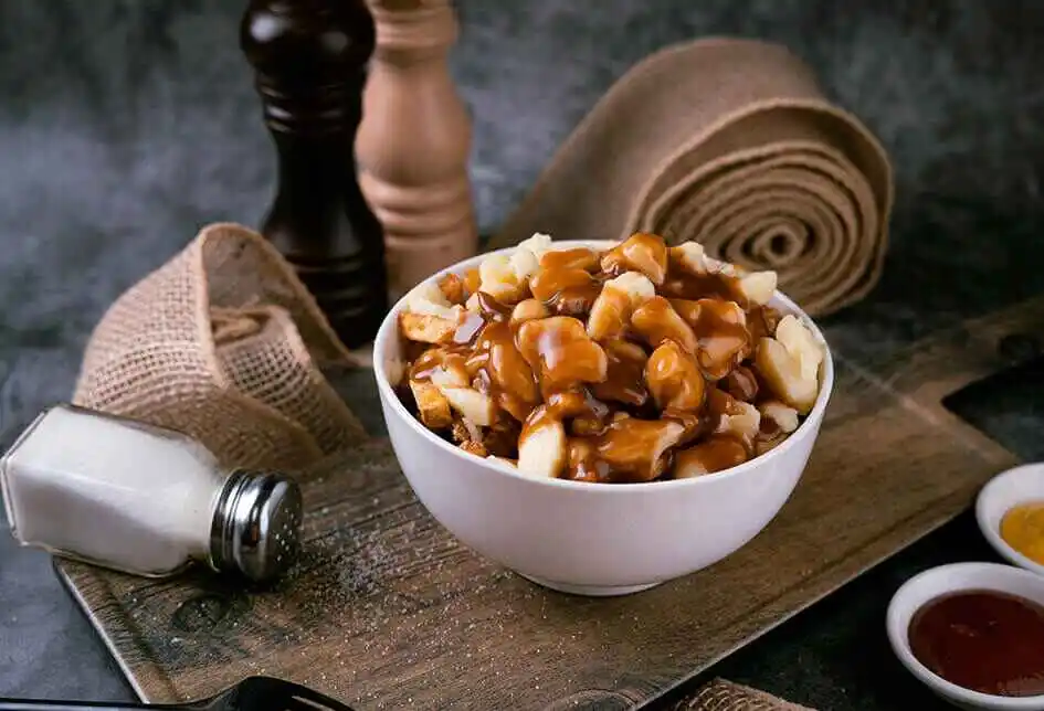 Homemade slow cooked flavorful pulled pork with fresh-cut fries, Quebec cheese curds and gravy
