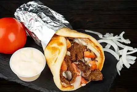 Halal-friendly Halifax Donair Pita with fresh Tomatoes, Onions and authentic donair sauce