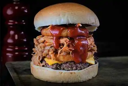 Our signature Barnyard Burger, fusion of home made Beef & Pulled Pork, Onion Rings and BBQ Sauce